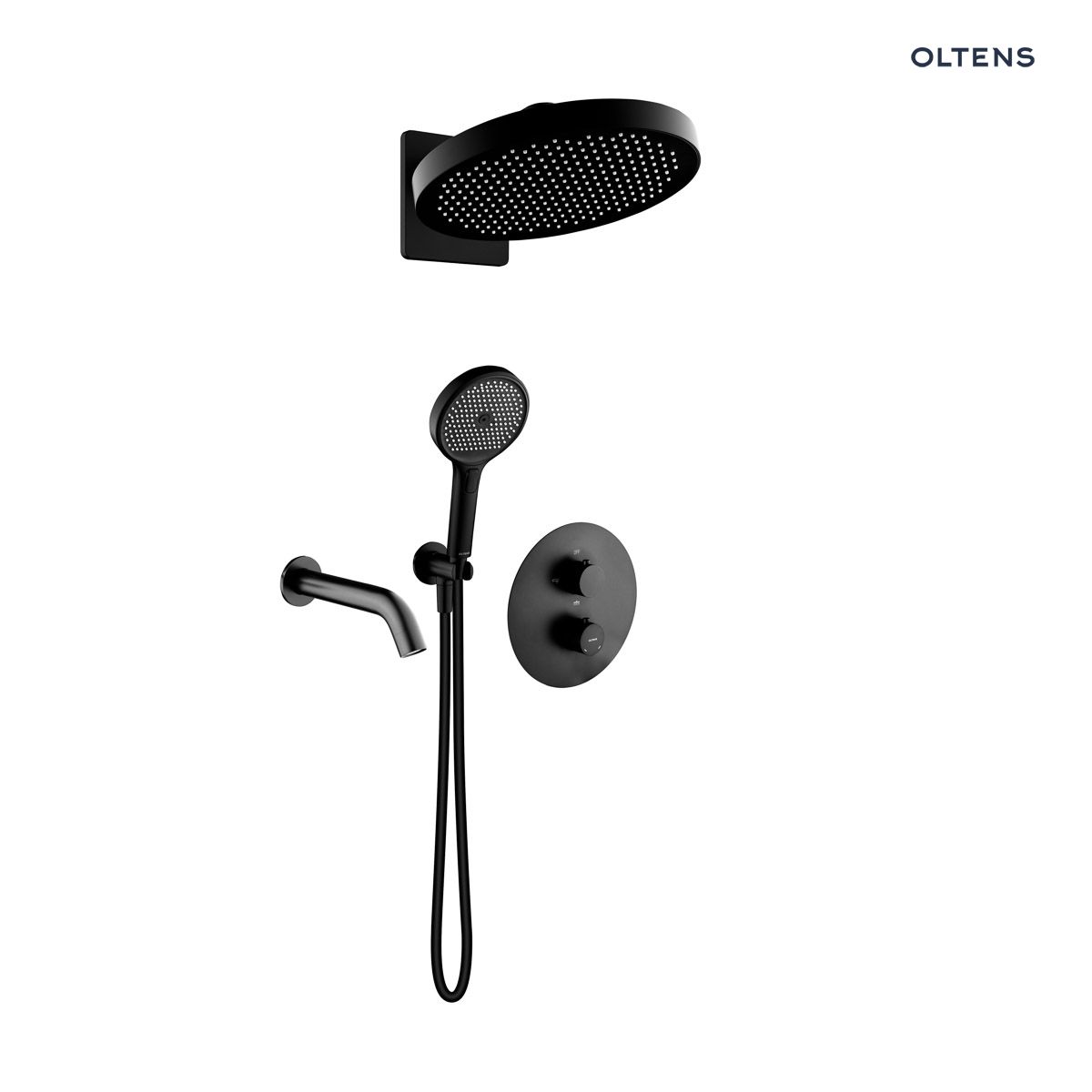 Popis produktu Oltens Katla set podomítkové vanové a sprchové baterie s dešťovou sprchou Regna a 3funkční sprchovou hlavicí Luva EasyClick, matná černá 36067300