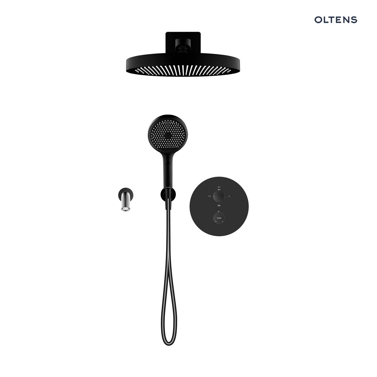 Obsah sady Oltens Katla set podomítkové vanové a sprchové baterie s dešťovou sprchou Regna a 3funkční sprchovou hlavicí Luva EasyClick, matná černá 36067300