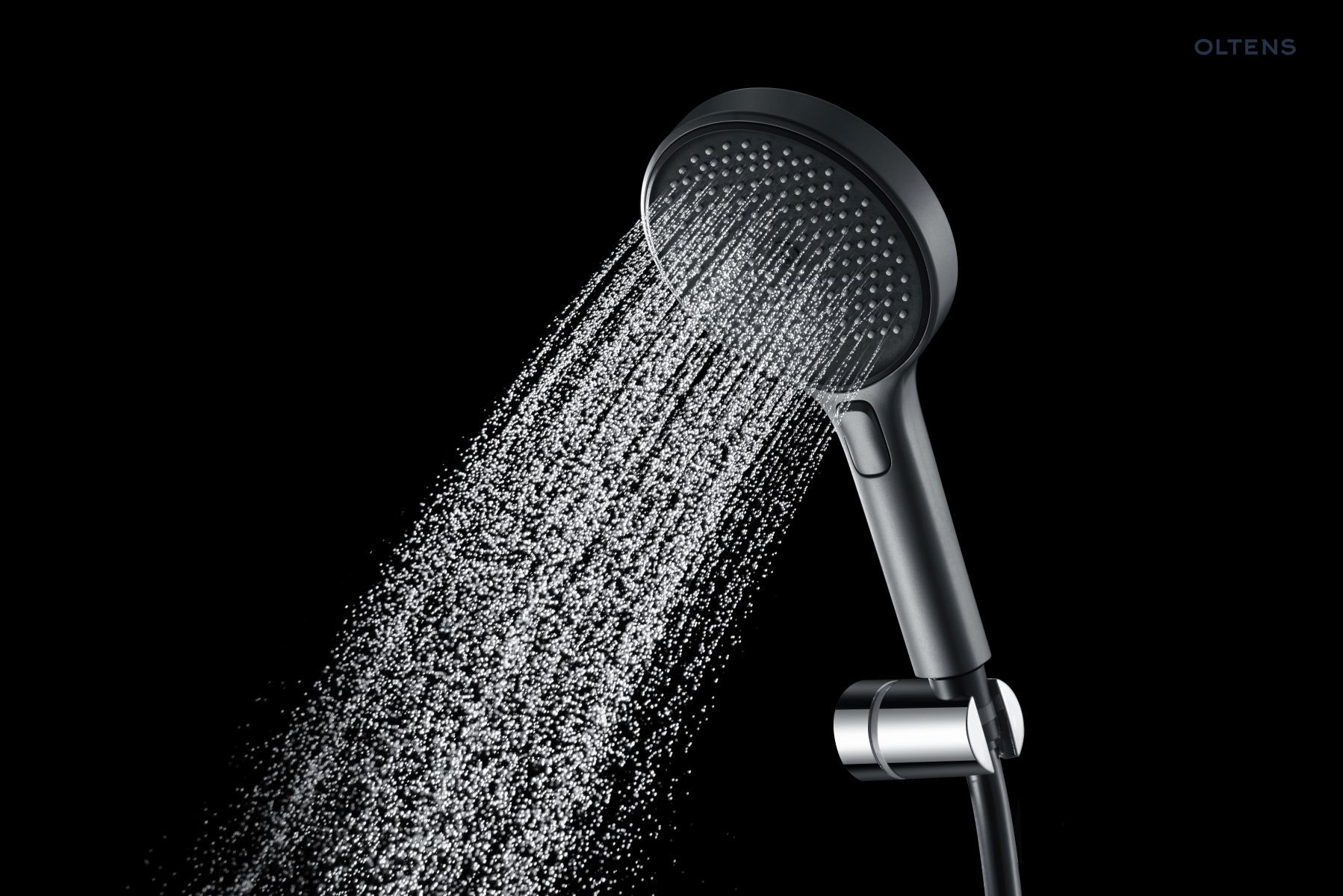 The Luva EasyClick shower handset is a stylish addition to any bathroom. Its round shape makes it a perfect choice for classic interiors. Combining elegant design with everyday convenience, it allows you to switch water modes effortlessly using the Oltens EasyClick button, operable with just one hand. The handset offers three spray settings: rain, soft, and massage. It also features the EcoStream technology, ensuring a continuous, even water flow during showering.