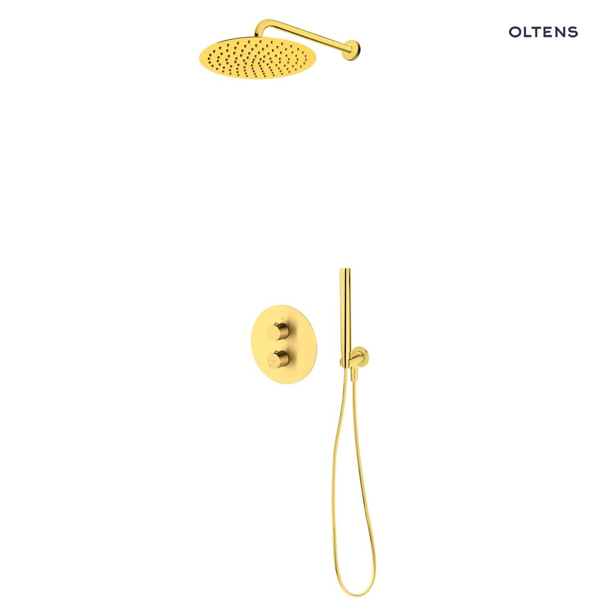 Cechy produktu Zestaw Oltens Katla bateria podtynkowa termostatyczna z deszczownicą 30 cm Vindel i kompletem prysznicowym Ume złoto szczotkowane 36608810