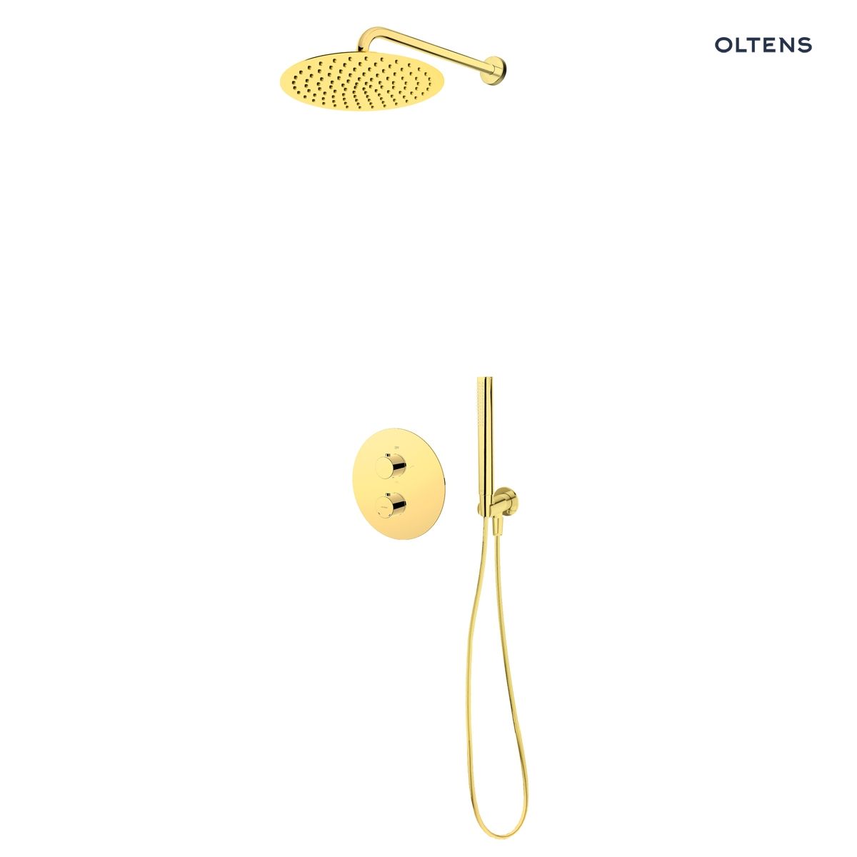 Cechy produktu Zestaw Oltens Katla bateria podtynkowa termostatyczna z deszczownicą 30 cm Vindel i kompletem prysznicowym Ume złoty połysk 36608800
