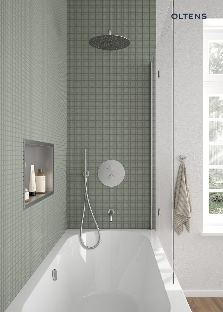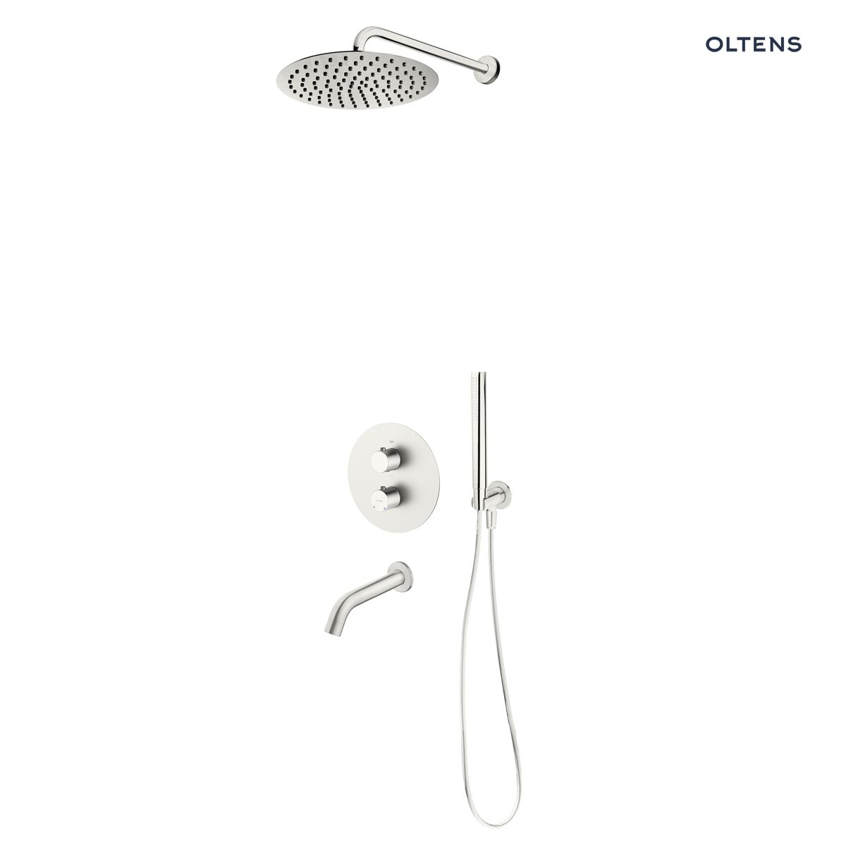 Cechy produktu Zestaw Oltens Katla bateria podtynkowa termostatyczna z wylewką wannową Molle z deszczownicą 30 cm Vindel i kompletem prysznicowym Ume nikiel 36611910