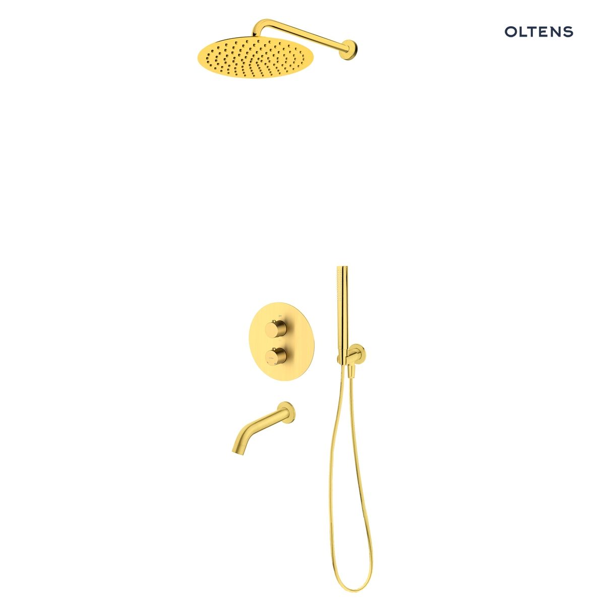Cechy produktu Zestaw Oltens Katla bateria podtynkowa termostatyczna z wylewką wannową Molle z deszczownicą 30 cm Vindel i kompletem prysznicowym Ume złoto szczotkowane 36611810