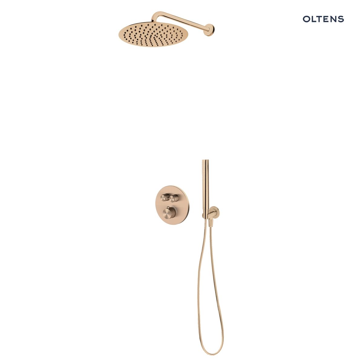 Opis produktu Zestaw Oltens Onega bateria wannowo - prysznicowa podtynkowa z deszczownicą 30 cm Vindel i kompletem prysznicowym Ume miedź szczotkowana 36617610