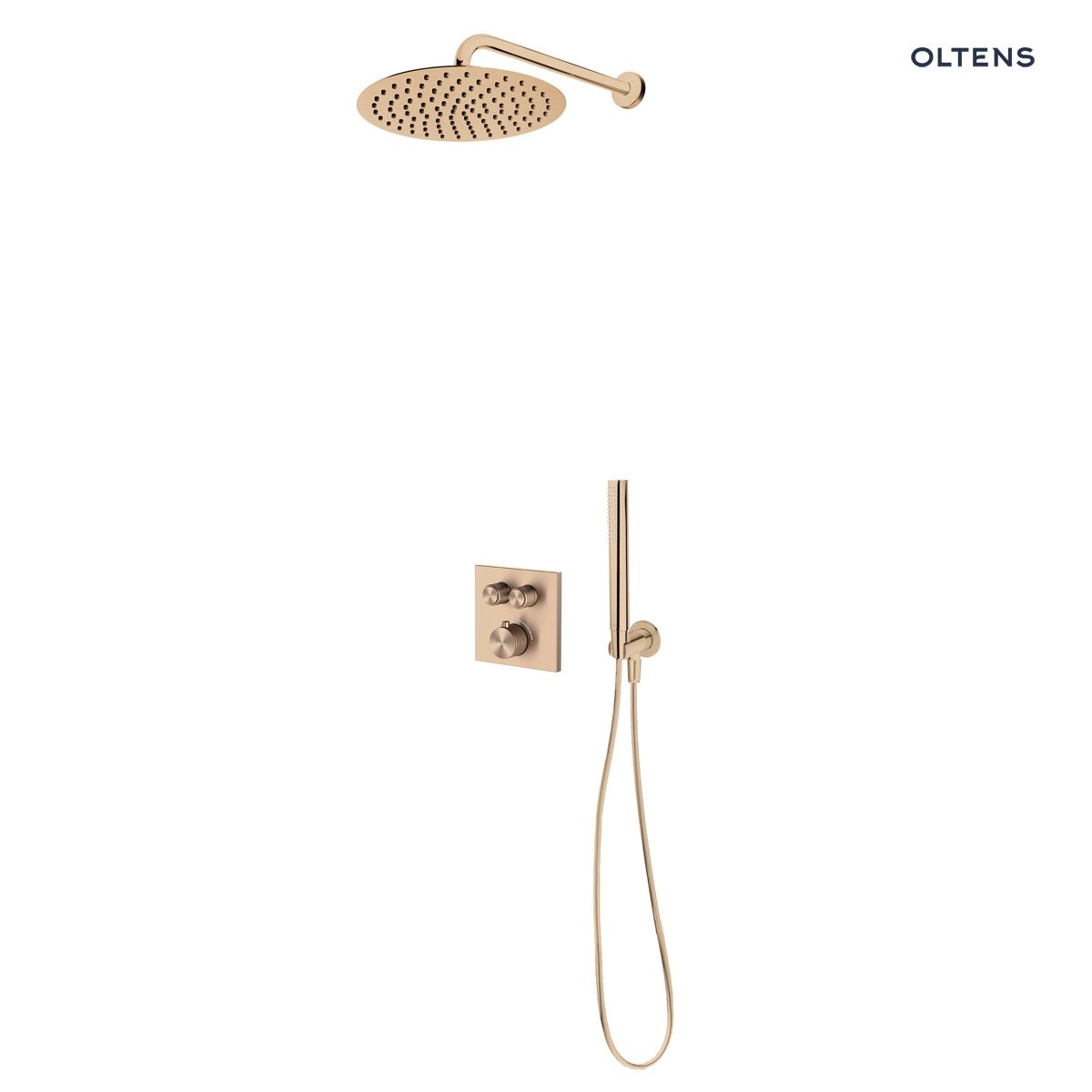 Opis produktu Zestaw Oltens Onega (S) bateria podtynkowa termostatyczna z deszczownicą 30 cm Vindel i kompletem prysznicowym Ume miedź szczotkowana 36620610