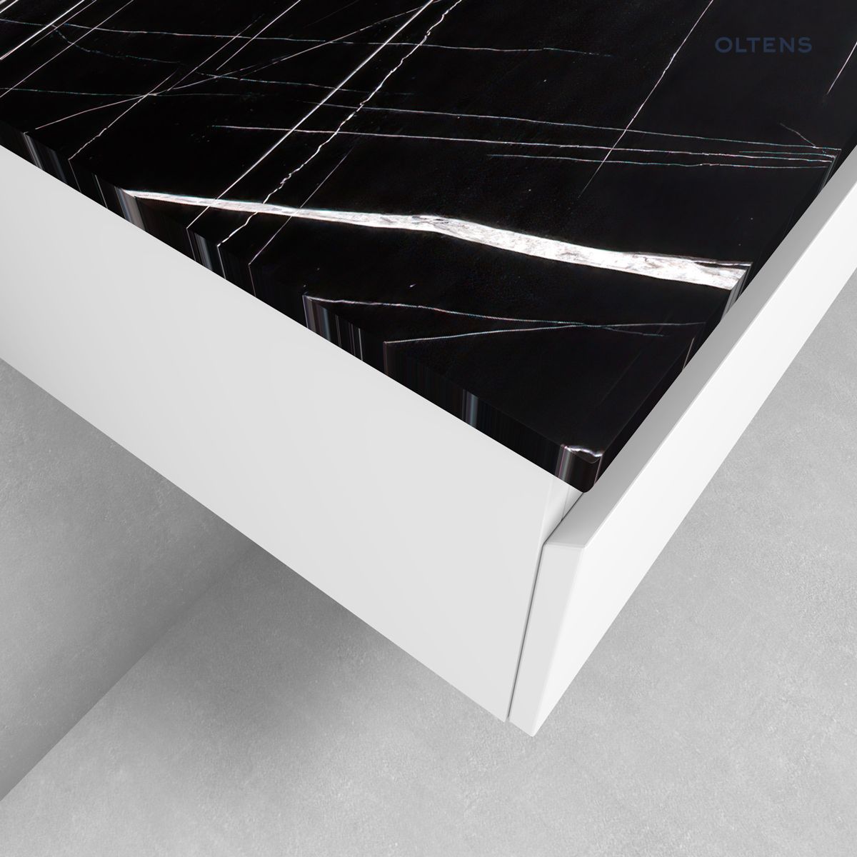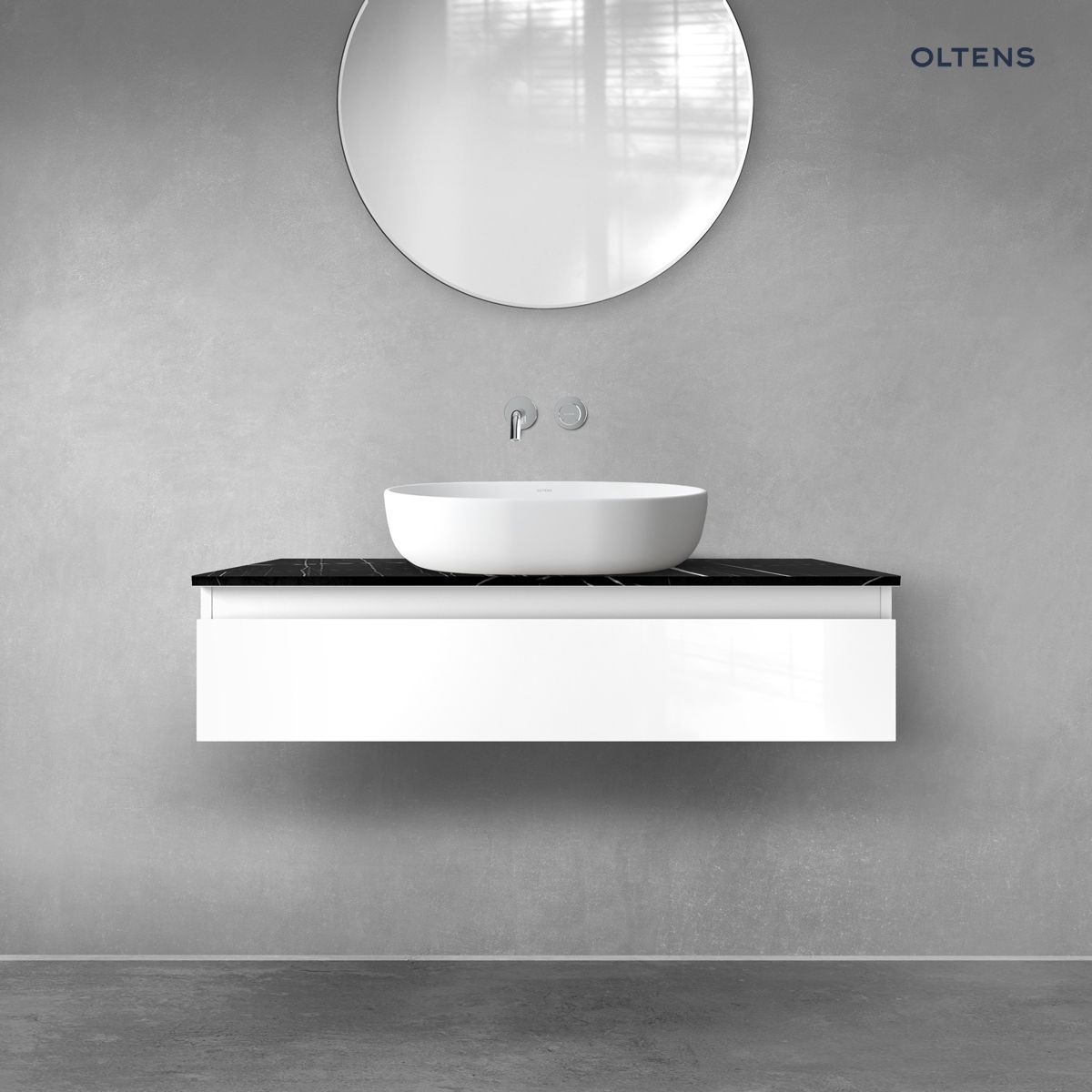 Opis produktu Zestaw Oltens Vernal szafka 100 cm podumywalkowa wisząca z blatem Tera biały połysk/czarny marmur 68716000
